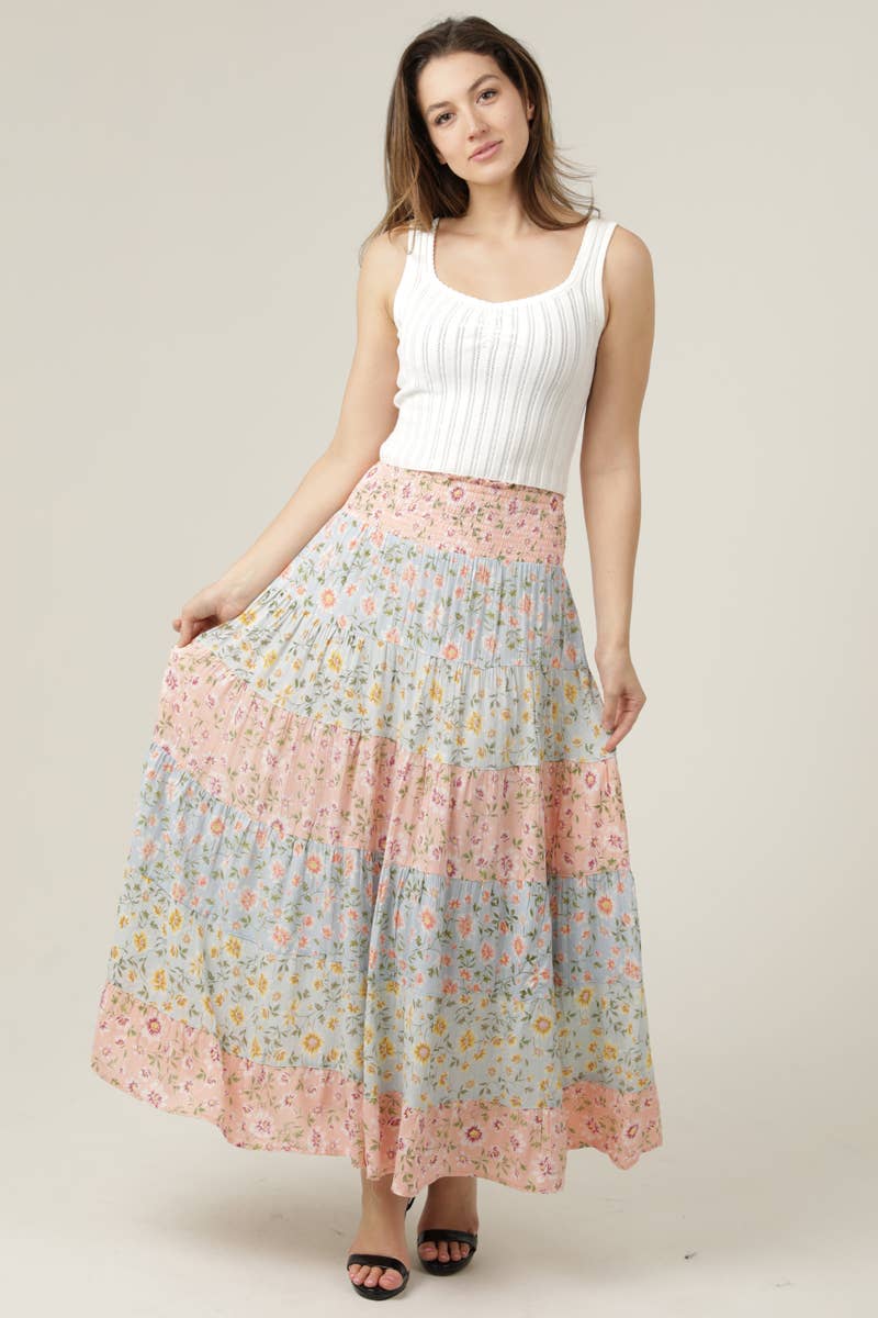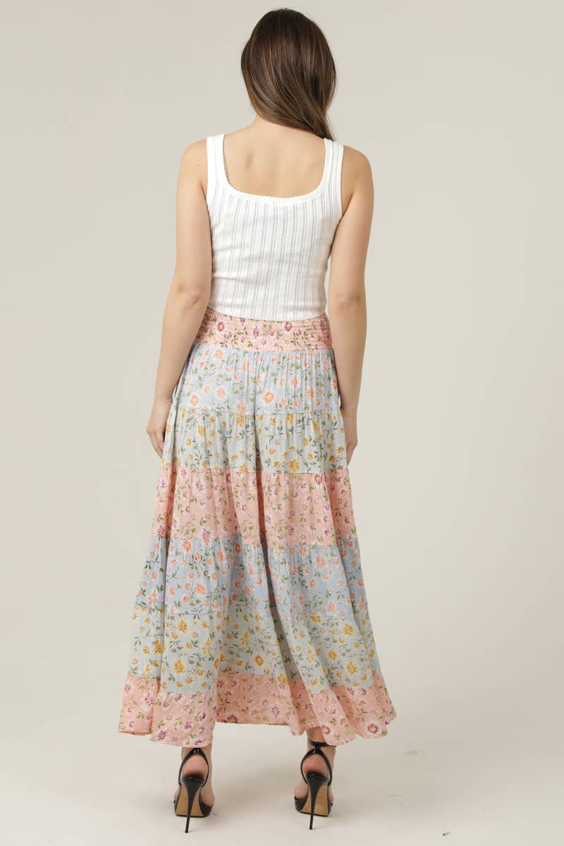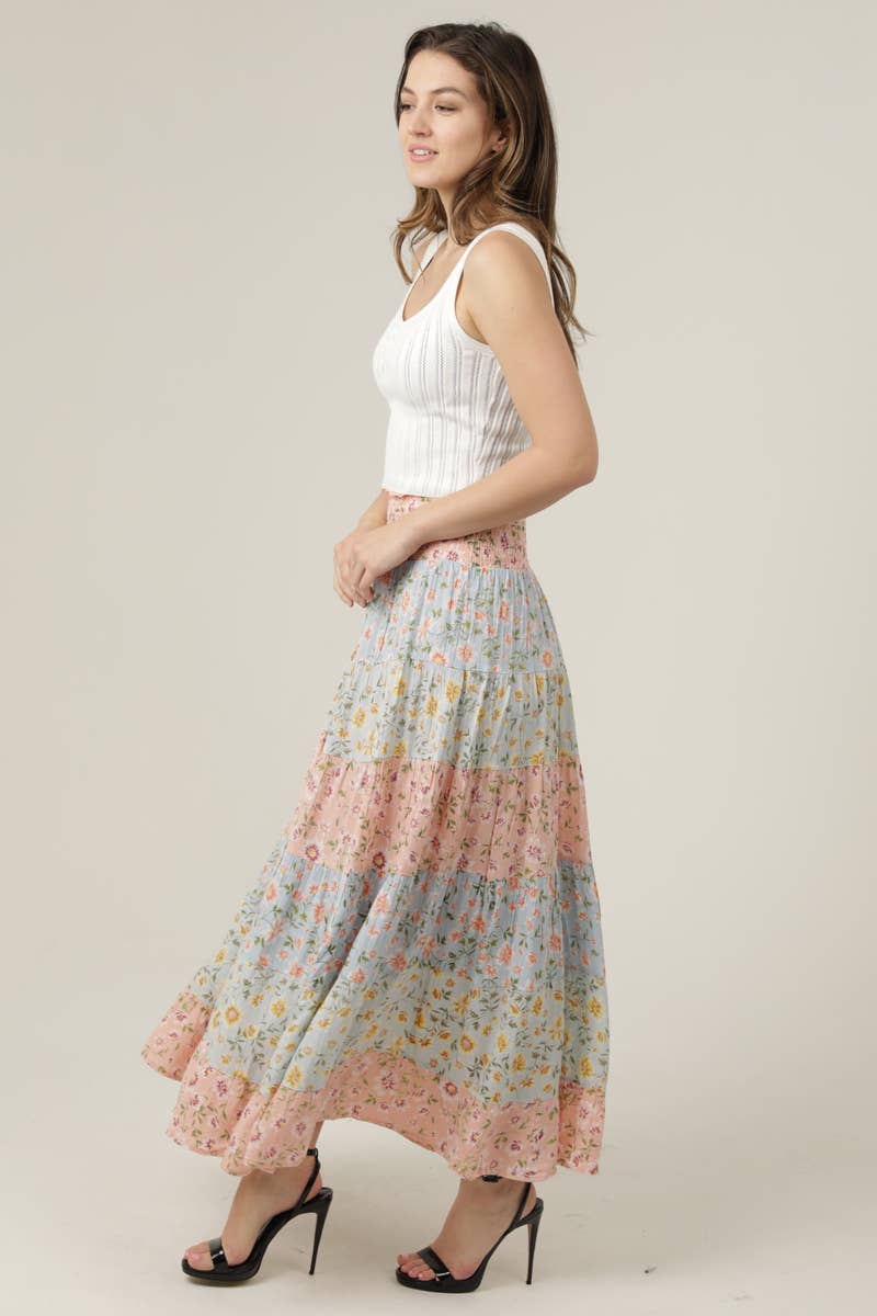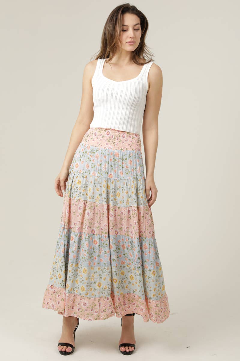 MIX PRINT TIERED A LINE MAXI SKIRT SMOCKED WAIST